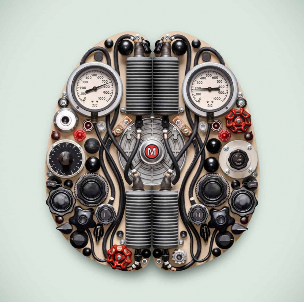In an age when artificial intelligence is dominating the headlines, this rendering of the human brain as an electromechanical device is utterly brilliant. It reflects the science that recognizes the differences and similarities between the left brain and the right brain, yet distills those into component objects that are recognizable in themselves. Meters. Switches. Control dials. Heavy cables. A hot-water valve. Everything that science says makes our brains function is mimicked here in a sharp, well-illuminated photo that Content Solutions included in a package about human memory.