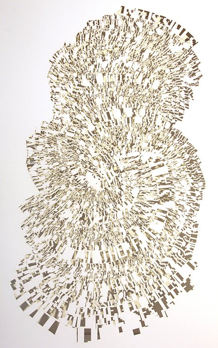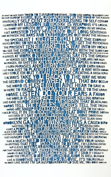 Ebon Heath’s typographical art, however, discards the typical florid poetry or simple declarative sentences in favor of images and sculptures more akin to digital word clouds … even though a closer examination of the component words makes it clear these are not random words sized according to their prominence or frequency in the piece.