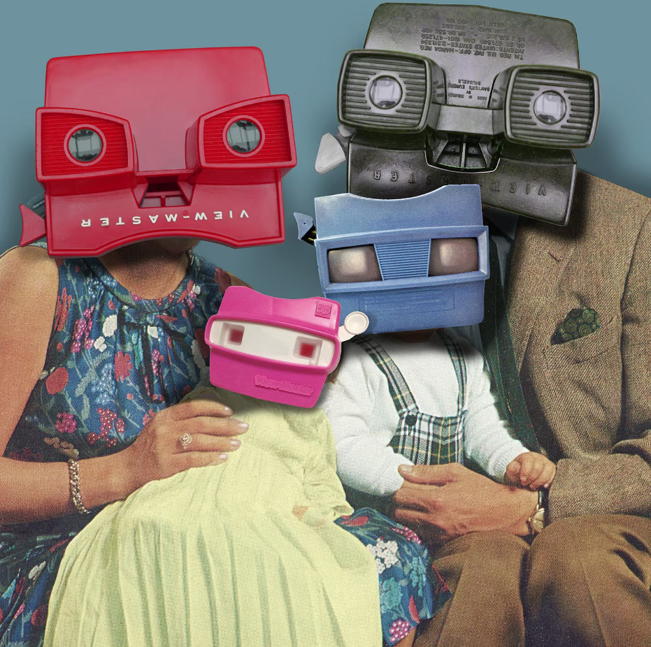 The use of View-Master 3D image devices as the faces — and particularly, the eyes — of the family members in It’s All in the Family turns the notion of a family portrait inside out. A family portrait is supposed to capture the family’s looks and, with any luck or photographer’s skill, emotional dynamic as frozen at a singular moment. The old-school technology of View-Master photographic slide reels — the descendants of stereoscopes — incorporated actual photos from tourist destinations as well as cartoon images and, for the right price, family photographs. So It’s All in the Family is a collage that looks at a family looking at the world looking at them.